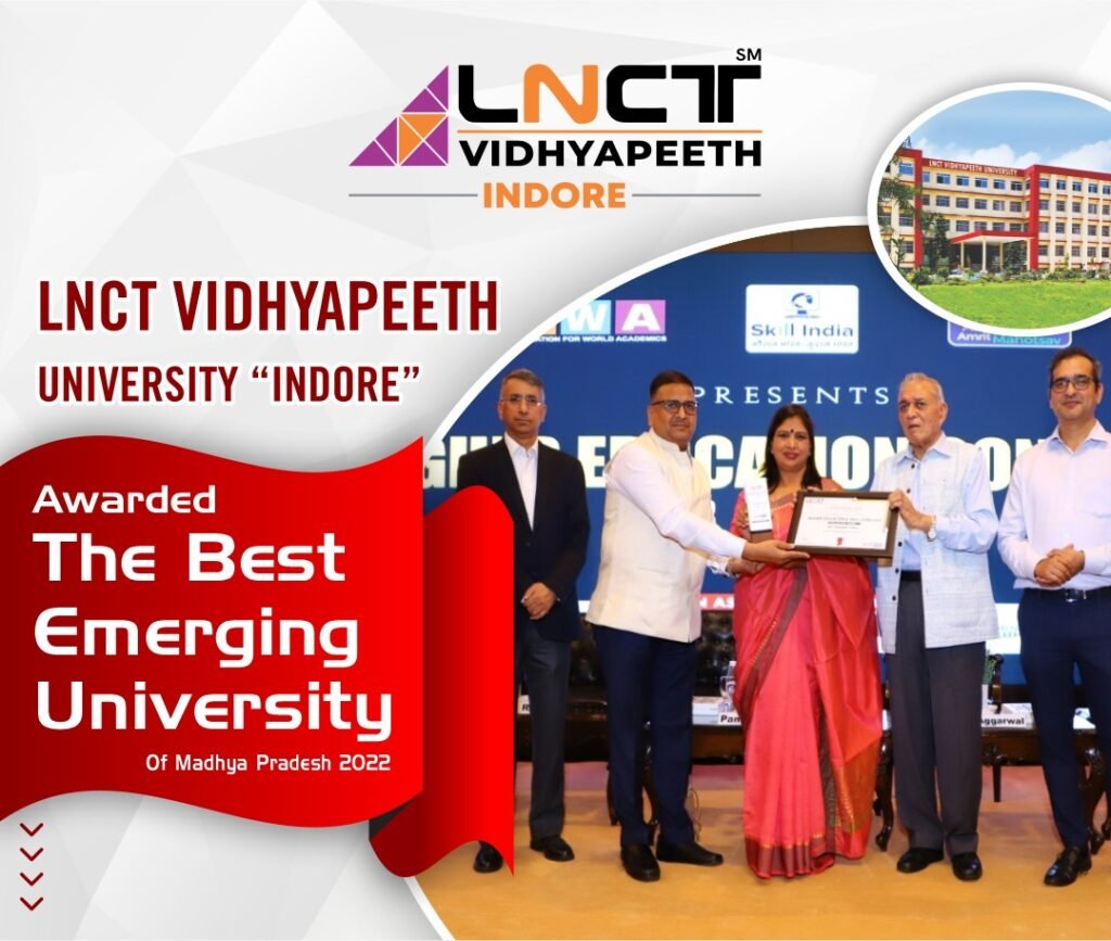 LNCT Vidhyapeeth University, Indore was honored with the prestigious title of Best Emerging University in Madhya Pradesh at the recently held Higher Education & Skill Conclave 2022, which took place at Hotel Le Meridian in New Delhi. Distinguished individuals such as Dr. Irfan A. Rizvi, Vice President FWA & Professor IMI, New Delhi, Dr. Pankaj Mittal, Secretary General of the Association of Indian Universities, Prof. K.K. Aggarwal, Chairman of the National Board of Accreditation, and Dr. Maneesh Mishra, Group Head Strategy at the National Skill Development Corporation, graced the event with their presence. The Higher Education & Skill Conclave aims to acknowledge the significant contributions made by education experts in the field of education. These esteemed awards serve as an inspiration for others, encouraging them to strive for even greater accomplishments.